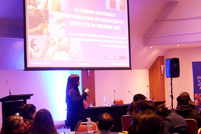 El Servicio Nacional de Menores, junto al Servicio de Reinserción Juvenil y Gendarmería de Chile, participó en la XI Jornada Nacional e Internacional de Educación en Contextos de Encierro 2025, organizada por la División de Educación General del Ministerio de Educación, a través del equipo de Educación de Personas Jóvenes y Adultas (EPJA), una actividad que reunió a directores de escuelas, coordinadores educativos y representantes de recintos penales y centros de justicia juvenil de todo el país, con el propósito de compartir experiencias y reflexionar sobre los avances y desafíos en materia de educación en contextos de encierro.
