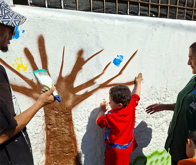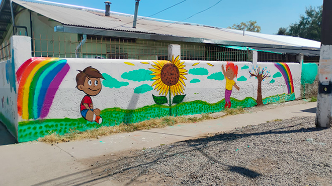 Los jóvenes en el Centro Semicerrado (CSC) Calera de Tango han iniciado un significativo proyecto colaborativo de muralismo en el jardín infantil Florecer de Pedro Aguirre Cerda. Esta iniciativa busca no solo mejorar los espacios para los niños y la comunidad con la ejecución de murales en el frontis, sino también embellecer el entorno mediante la poda, desmalezado, plantación de árboles y el ordenamiento general del espacio educativo y comunitario.
